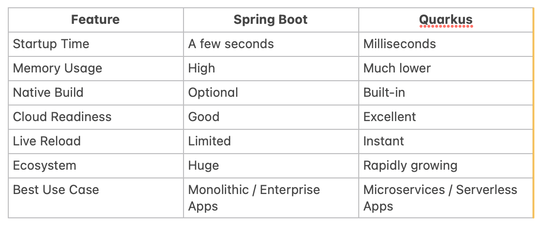 If you’re from a Spring Boot background (like most Java developers), here’s how Quarkus stacks up: